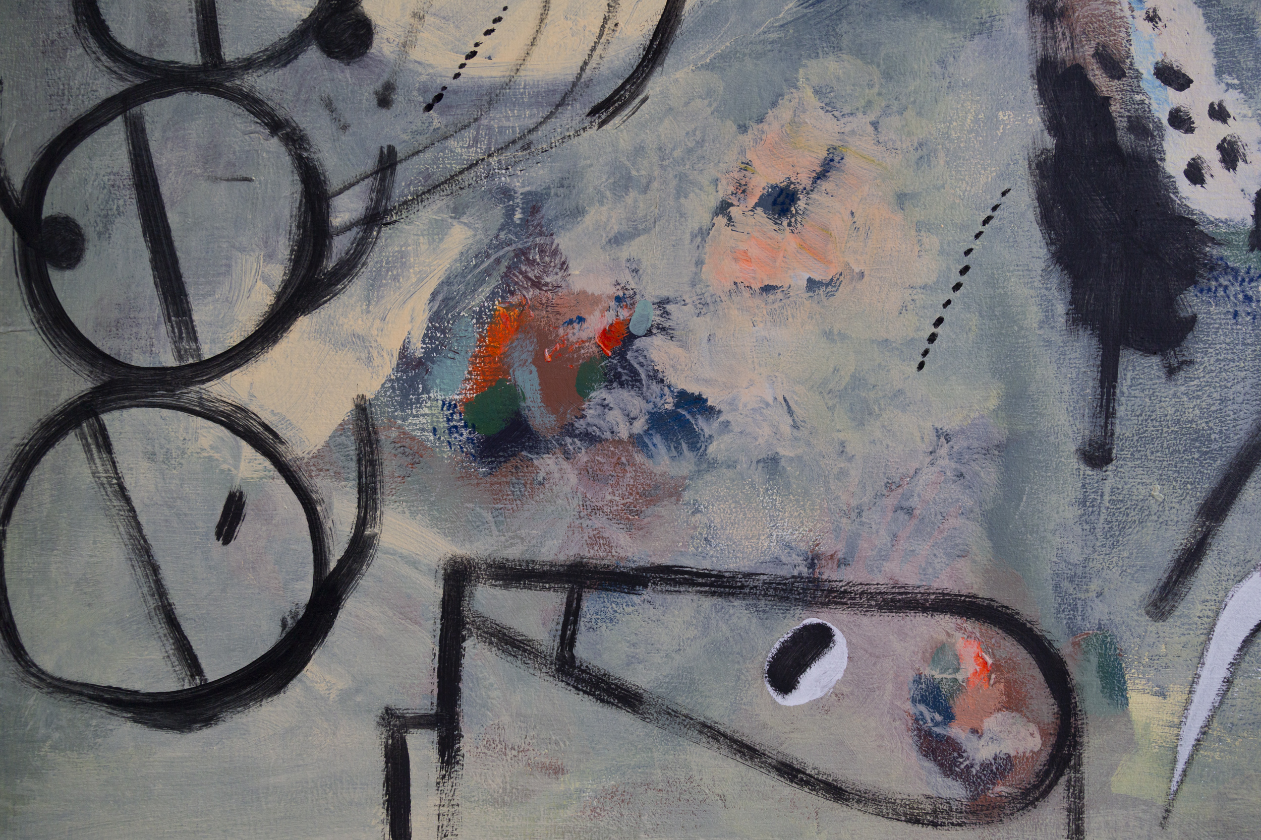 In that vein, his time at fundación/op.cit. finds him making his first ever mural paintings and they are ephemeral (will be unglued like gigantic stickers at the end) and mostly rendered with Comex wall-paint. They represent a more abstracted, but maybe also wackier, version of the interests and obsessions that have paved his practice: the idea of collapse, empirically, as the eventual falling apart of society and the institutions that keep it in some type of shape; but also, more widely, the collapsing of most types of hierarchies, of one culture over another, of one type of human over another, of humans over animals, etc. The larger piece is ‘all over the place’ in the sense that it seems to be mapping the wild ramblings of our conspiranoiac present: over here a molecule being messed with, next to a crack pipe, next to the black lungs of our planet, next to intestines turned serpent, all washed with some toxic rain and surrounded by weapons. It sounds dark but the treatment Michael gives it, is not: it is childish more than it is ‘primitive’, the colors are loud but not garish, the gestures evoke Philip Guston’s as does a criticism that does not absolve the artist himself.