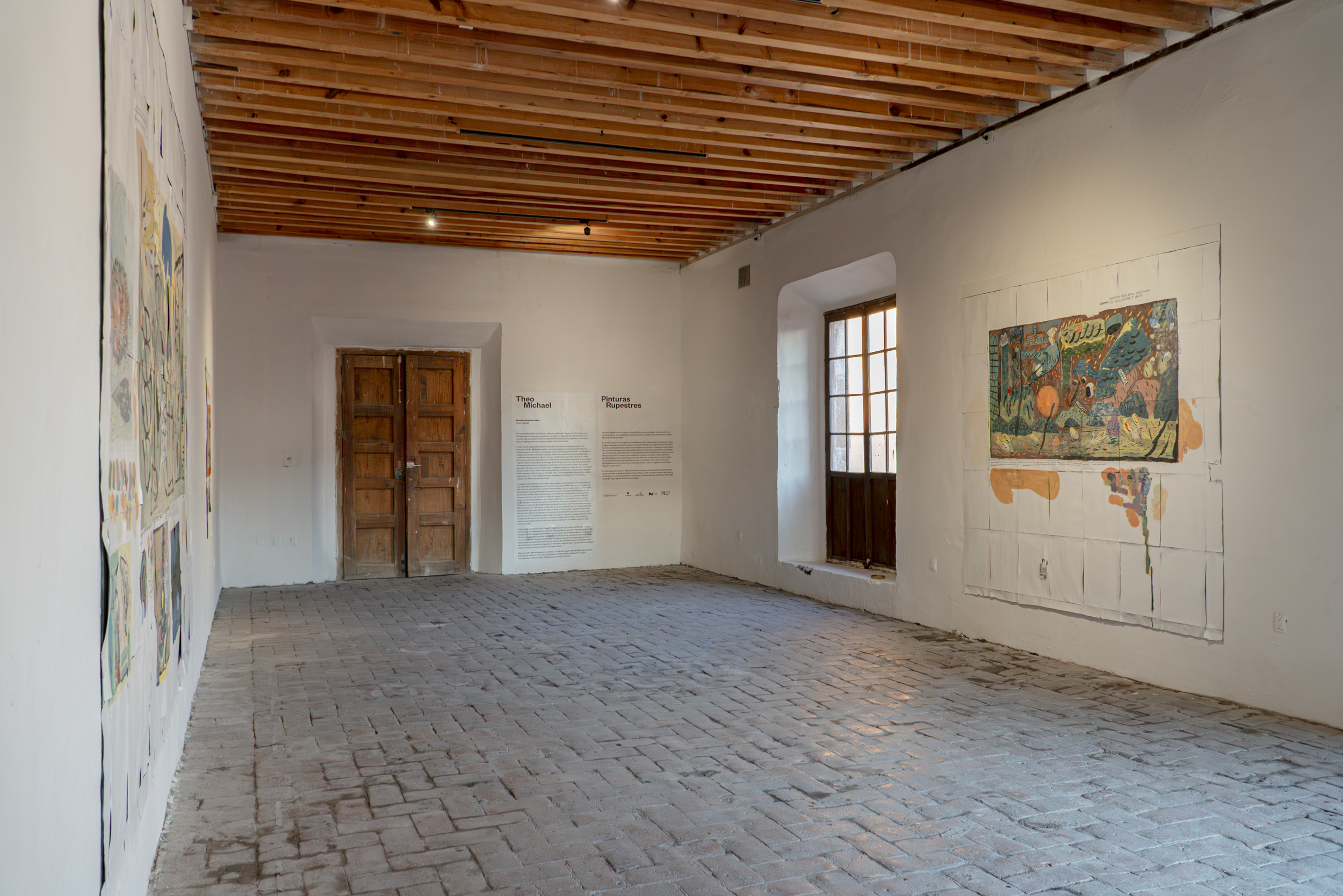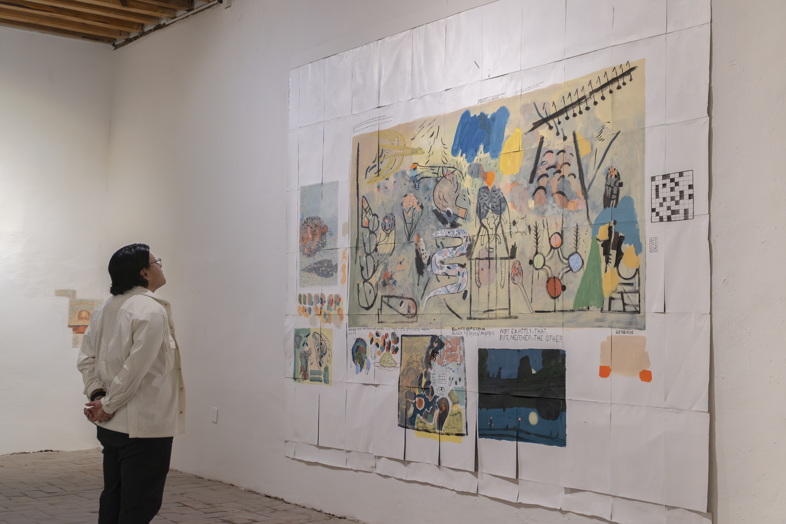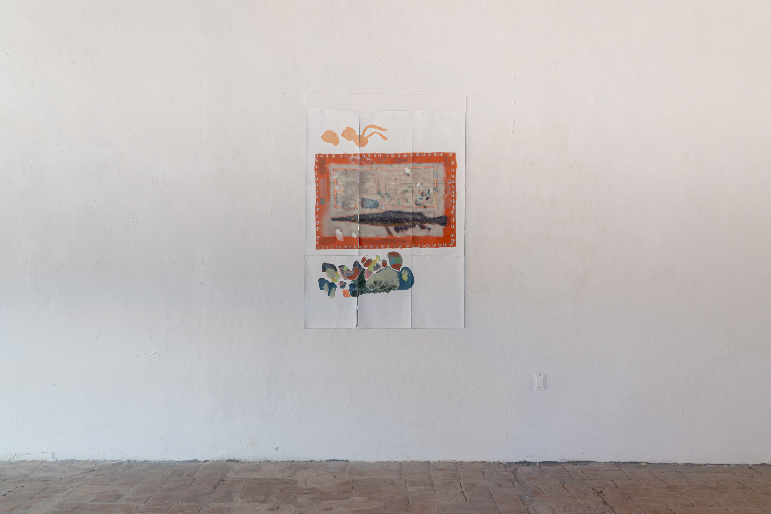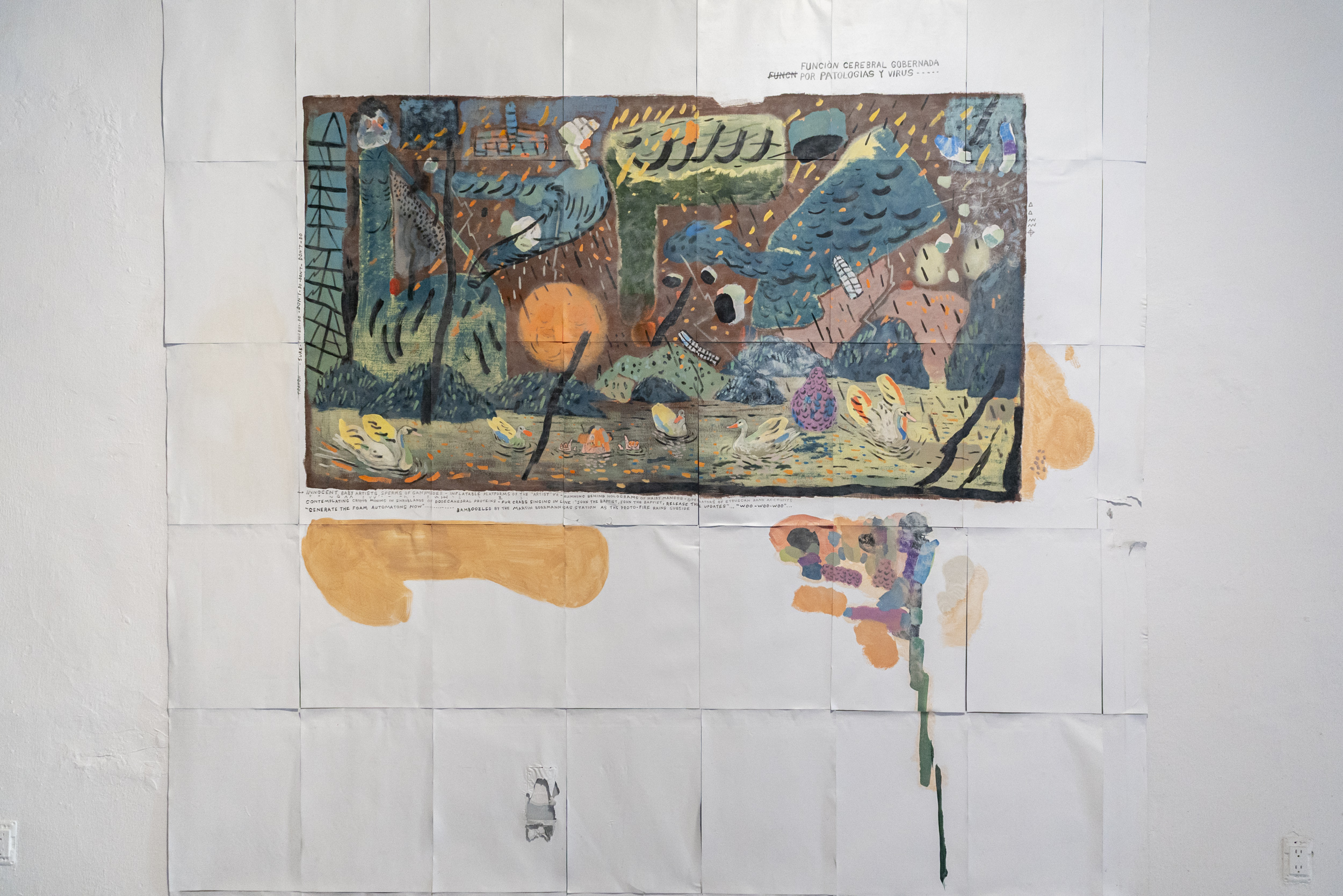 In the same vein, eschewing more of the same, during his time at the Op.cit. Foundation, Michael devoted himself to creating his first murals. True to his fickleness, they are ephemeral—they peel off like giant stickers at the end—and were made with Comex paint, the kind used to paint walls. They represent an abstraction, no less absurd for that, of the interests and obsessions that have shaped his practice to date: the ideal of collapse, empirical, the eventual disintegration of society and the institutions that still give it some form; but more broadly, the collapse of hierarchies, of one culture over another, of one type of human over another, of animals over humans, among others. The largest piece is something like a mapping of the unprecedented comings and goings of our conspiracy-ridden present: here, a molecule being altered, next to a crack pipe, next to the blackened lungs of our planet; there... intestines turned into snakes, all bathed in toxic rain and surrounded by different types of weapons.