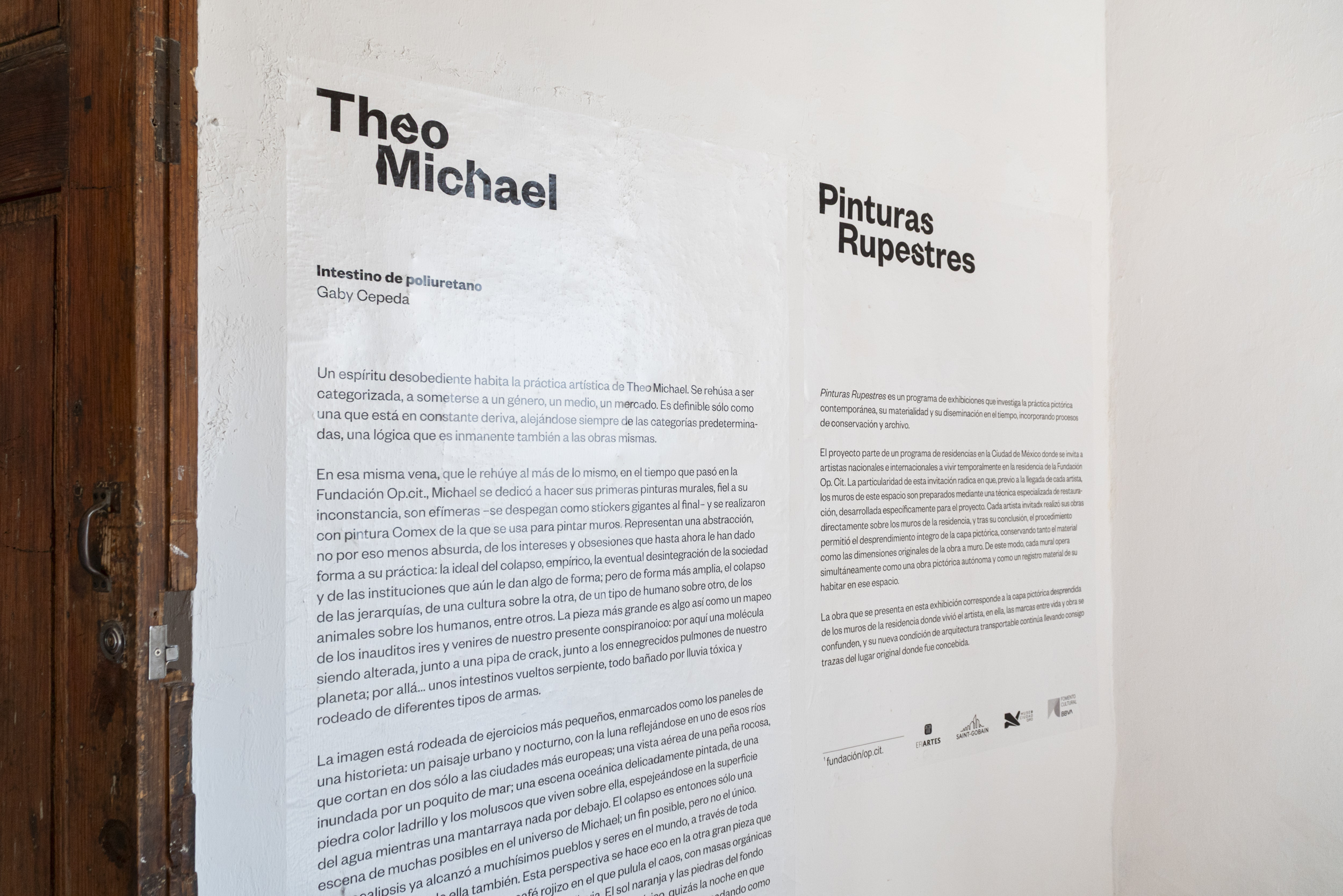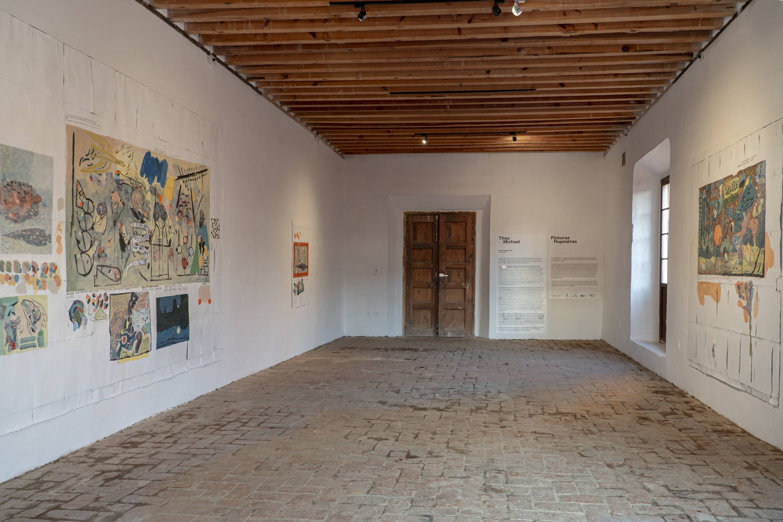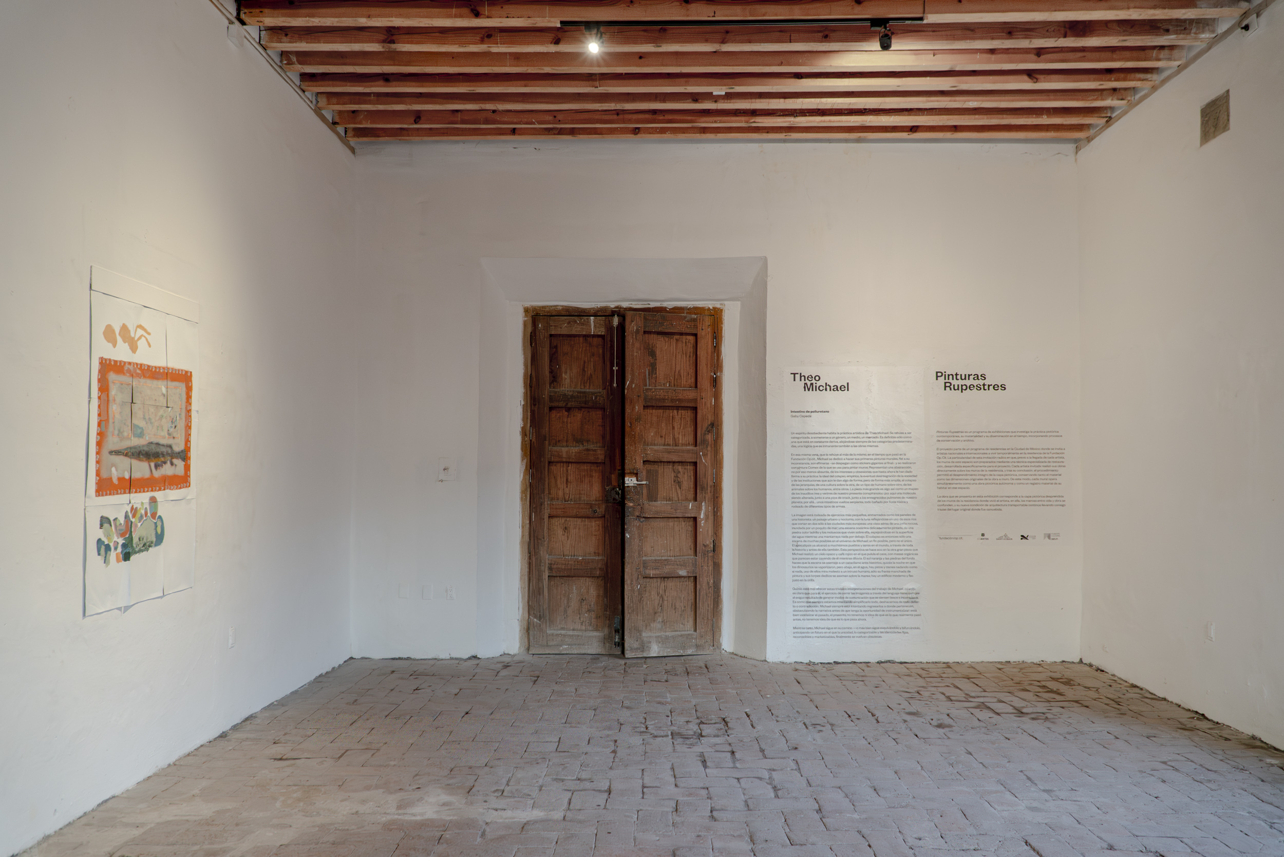 In the same vein, eschewing more of the same, during his time at the Op.cit. Foundation, Michael devoted himself to creating his first murals. True to his fickleness, they are ephemeral—they peel off like giant stickers at the end—and were made with Comex paint, the kind used to paint walls. They represent an abstraction, no less absurd for that, of the interests and obsessions that have shaped his practice to date: the ideal of collapse, empirical, the eventual disintegration of society and the institutions that still give it some form; but more broadly, the collapse of hierarchies, of one culture over another, of one type of human over another, of animals over humans, among others. The largest piece is something like a mapping of the unprecedented comings and goings of our conspiracy-ridden present: here, a molecule being altered, next to a crack pipe, next to the blackened lungs of our planet; there... intestines turned into snakes, all bathed in toxic rain and surrounded by different types of weapons.