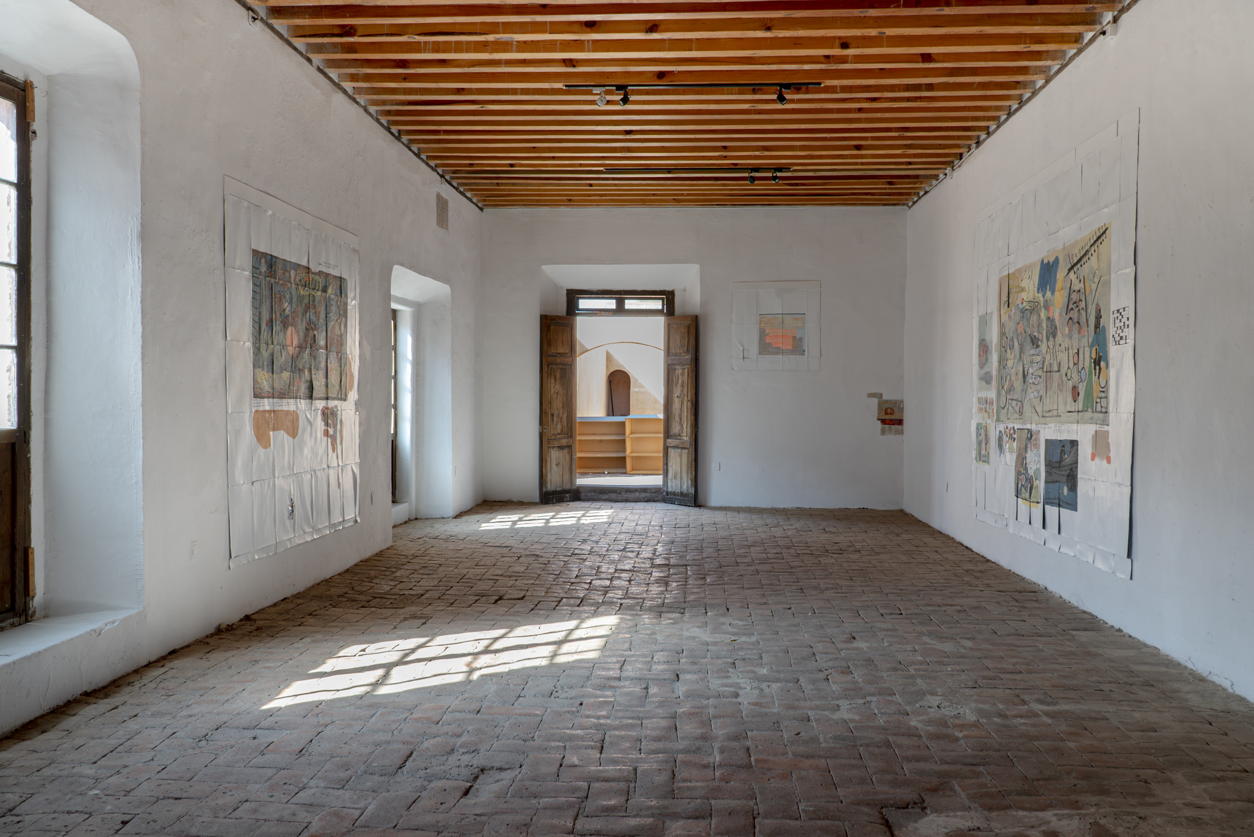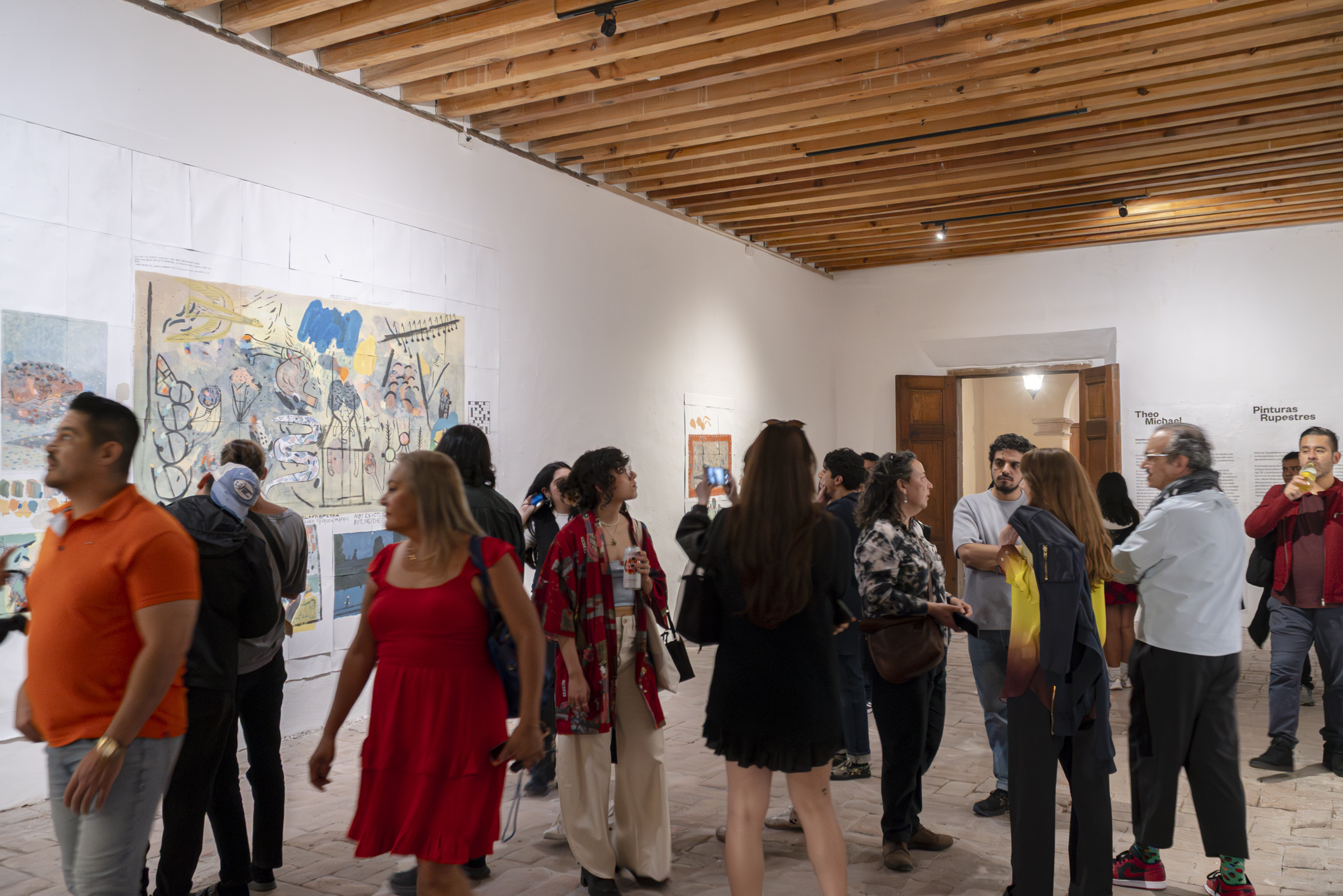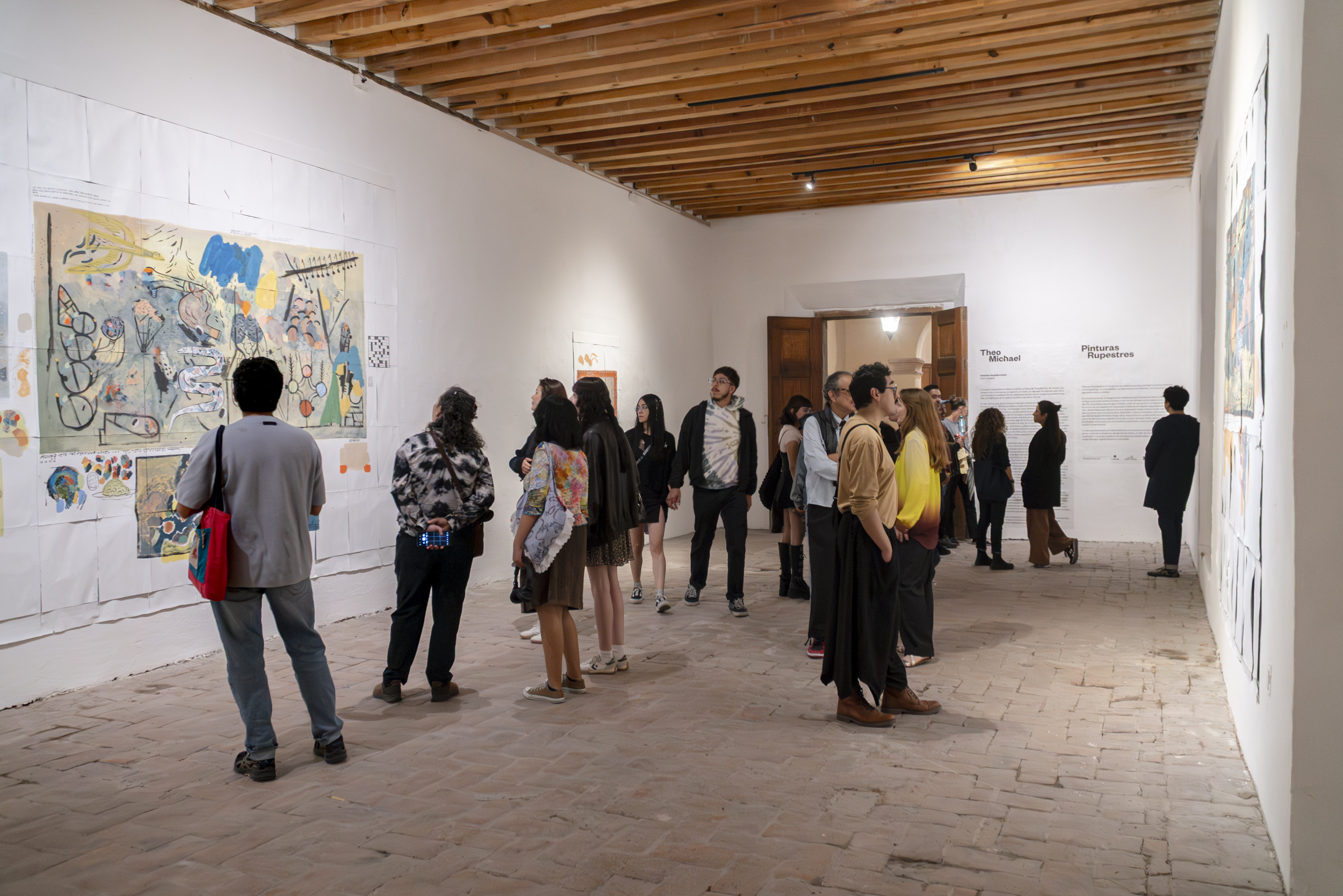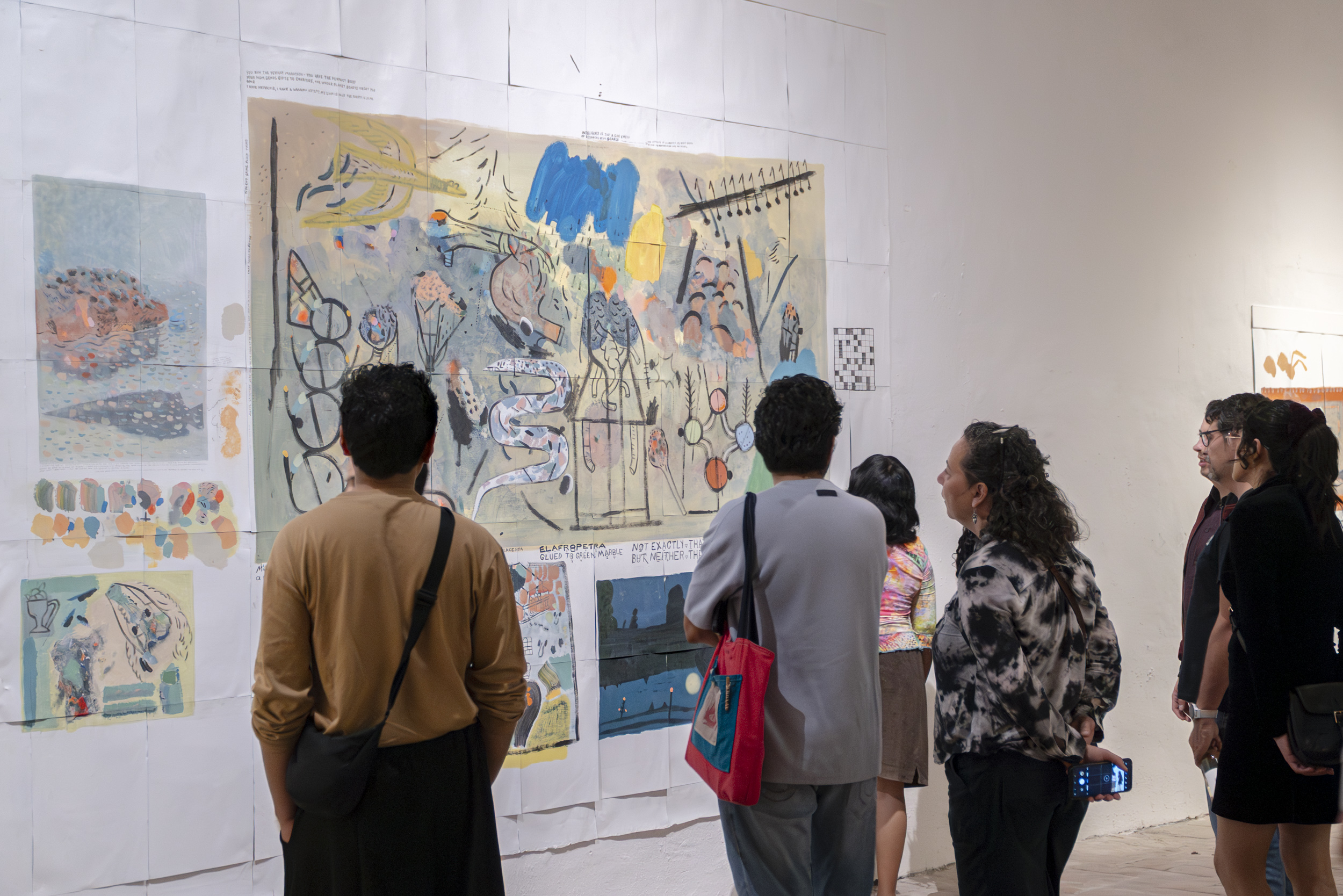 In the same vein, eschewing more of the same, during his time at the Op.cit. Foundation, Michael devoted himself to creating his first murals. True to his fickleness, they are ephemeral—they peel off like giant stickers at the end—and were made with Comex paint, the kind used to paint walls. They represent an abstraction, no less absurd for that, of the interests and obsessions that have shaped his practice to date: the ideal of collapse, empirical, the eventual disintegration of society and the institutions that still give it some form; but more broadly, the collapse of hierarchies, of one culture over another, of one type of human over another, of animals over humans, among others. The largest piece is something like a mapping of the unprecedented comings and goings of our conspiracy-ridden present: here, a molecule being altered, next to a crack pipe, next to the blackened lungs of our planet; there... intestines turned into snakes, all bathed in toxic rain and surrounded by different types of weapons.