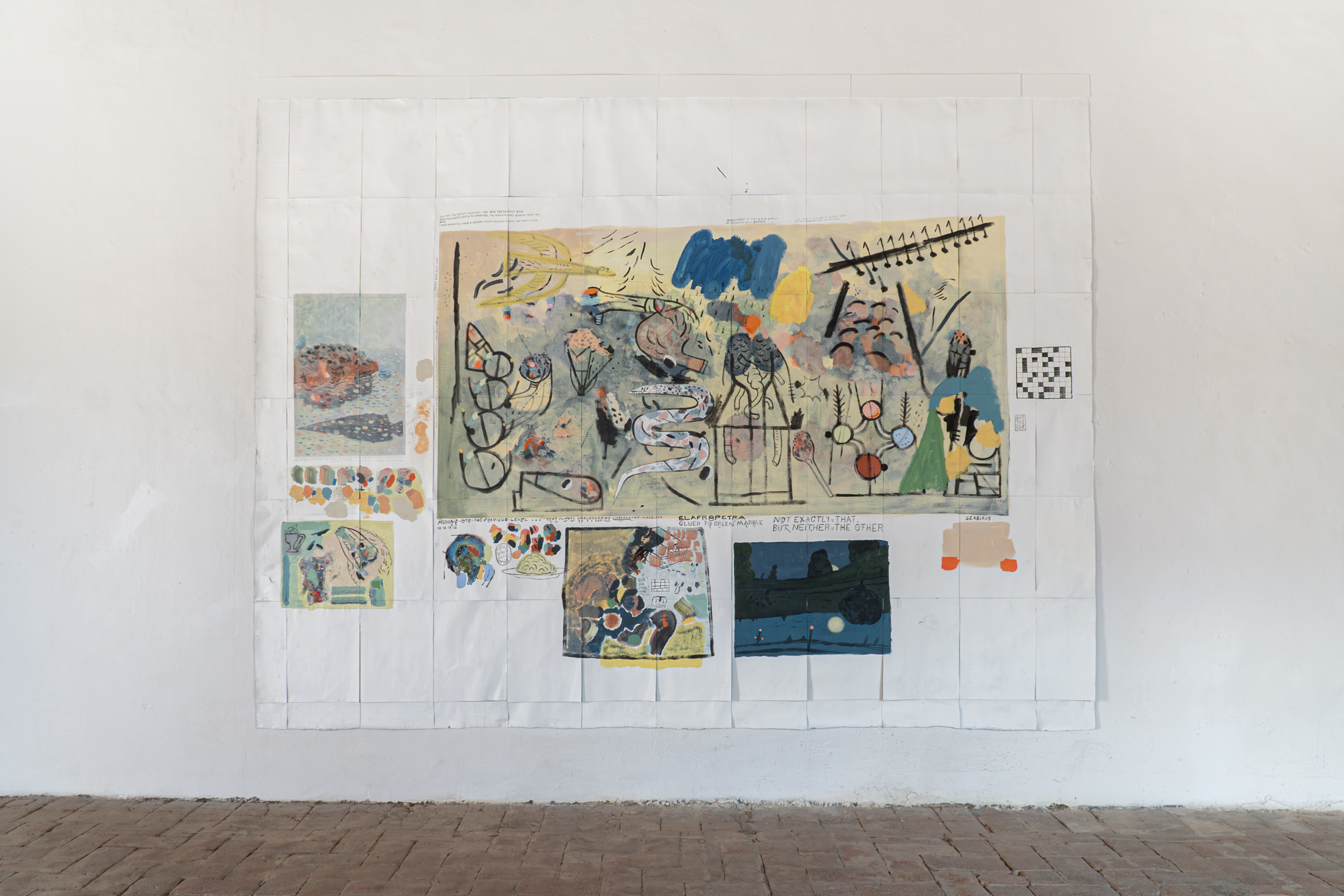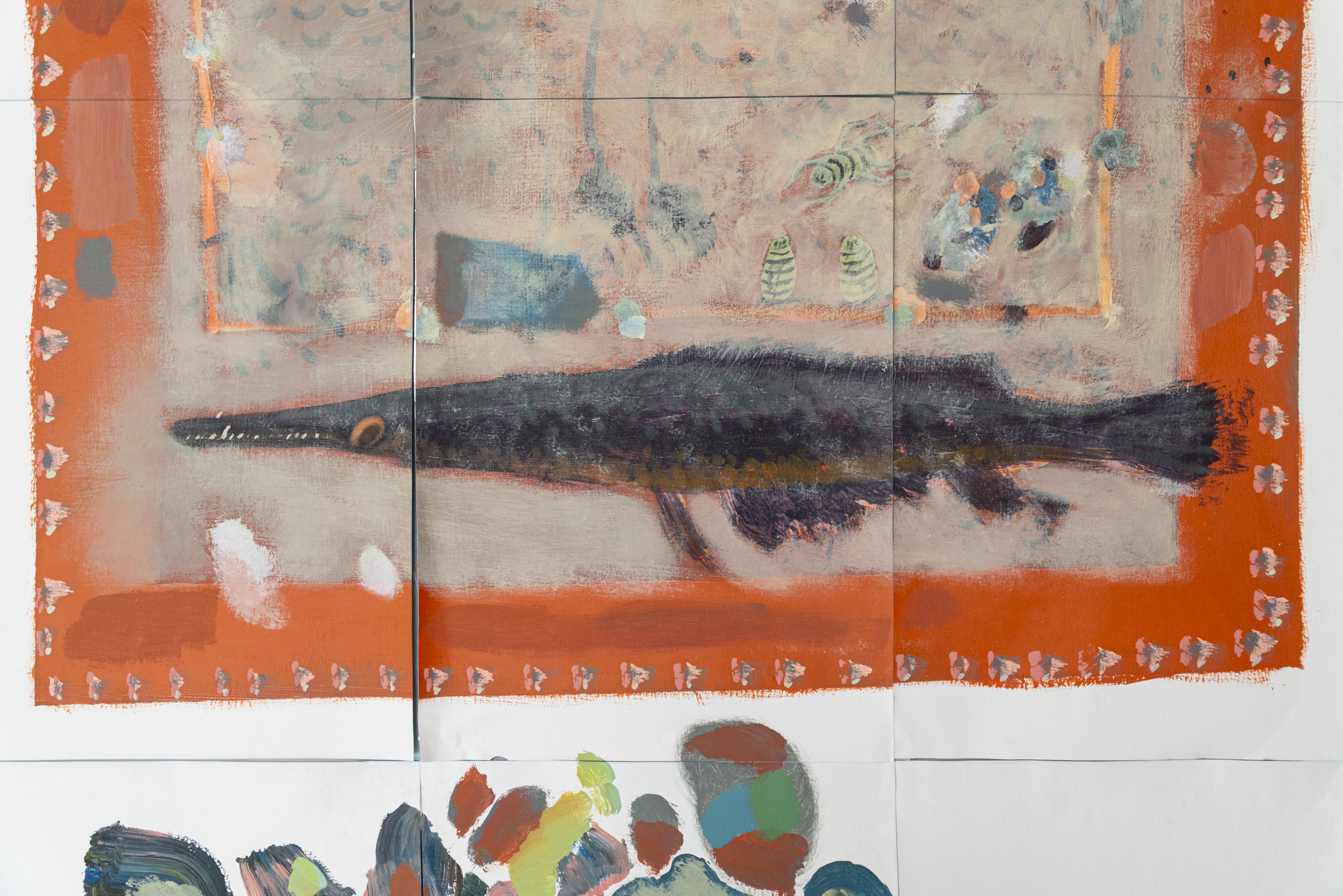 The image is surrounded by smaller exercises, framed like comic book panels: an urban nightscape, with the moon reflecting on one of those rivers that cut through only the most European cities; an aerial view of a rocky crag, flooded by a little bit of sea; a delicately painted ocean scene, with a brick-colored stone and the mollusks that live on it, mirroring themselves on the surface of the water while a manta ray swims below. The collapse is then just one scene of many possible ones in Michael's universe; a possible end, but not the only one. The apocalypse has already reached many peoples and beings in the world, throughout history and before it as well. This perspective is echoed in Michael's other great piece: an opaque, reddish-brown sky swarming with chaos, with organic masses that seem to be falling from it as it pours rain. The orange sun and the stones in the background make the scene resemble a prehistoric cataclysm, perhaps the night the dinosaurs vaporized, but below, in the water, there are ducks and swans swimming as if nothing had happened, one of them looking annoyed at a human intruder, only his paint-stained forehead and clumsy little fingers peeking out above the tide; there is an ugly modern building right on the shore.
